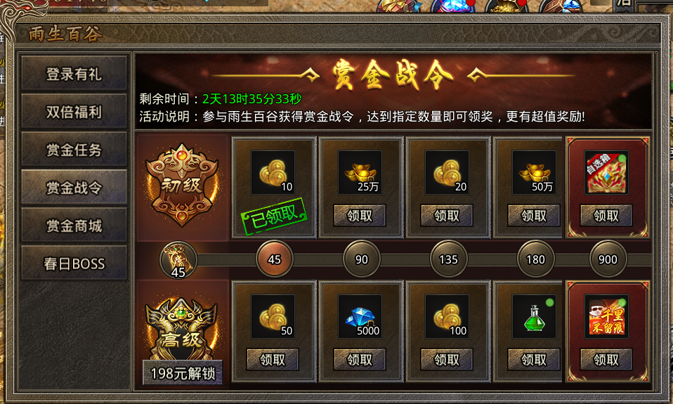 活动期间,累计获得一定数量赏金战令即可领取奖励,解锁高级战令可额外再领取高级战令奖励