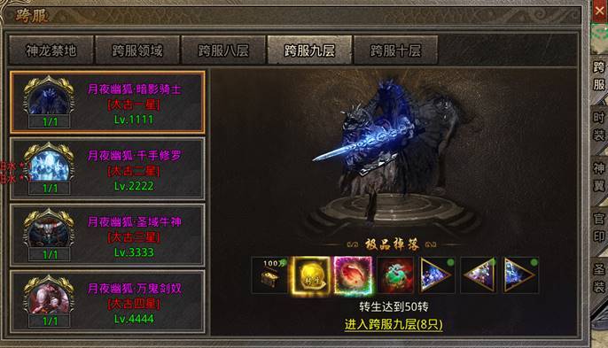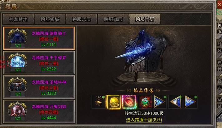 八、跨服坐骑地图新增第九层、第十层地图:进入条件分别为转生达标50转及转生达标50转1000级