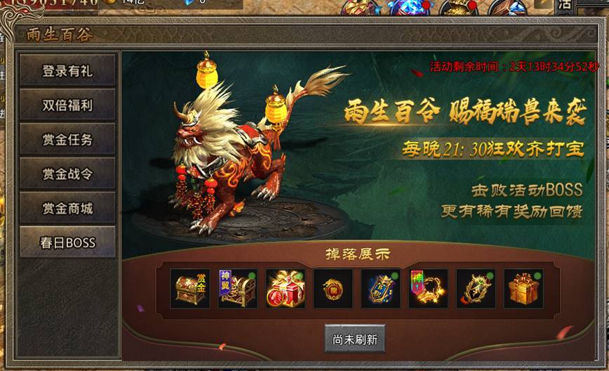 1:BOSS降临活动持续3天,每天21:30刷新赐福瑞兽一只,刷新地图:比奇城 ,刷新坐标:156 150