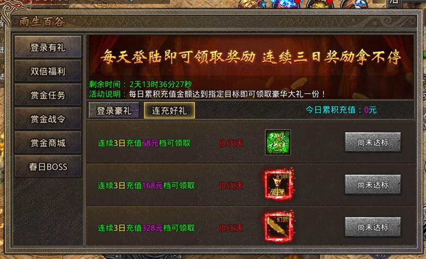 1.每日登录奖励 2.每日充值任意金额奖励 3.每日充值满68元奖励 4.每日充值满168元奖励 5.每日充值满328元奖励