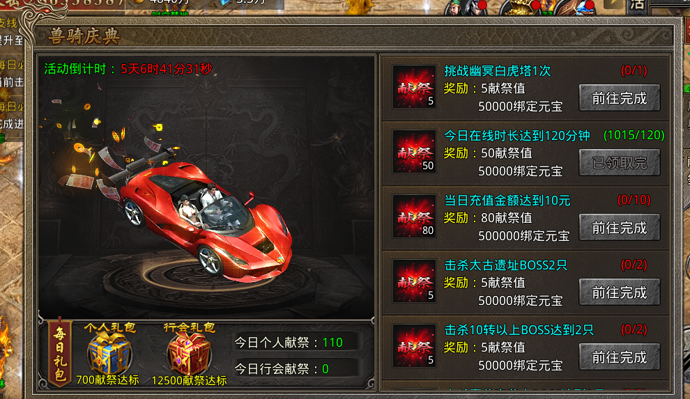 完成指定任务即可获得对应献祭值+元宝奖励,献祭任务次日0时重置数据