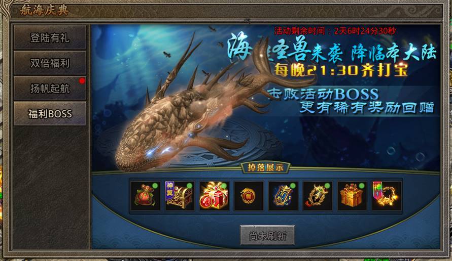 1:BOSS降临活动持续3天,每天21:30刷新海洋圣兽一只,刷新地图:比奇城 ,刷新坐标:156 150