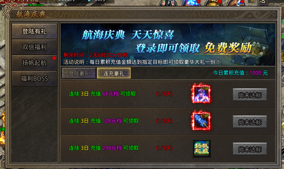 1.每日登录奖励 2.每日充值任意金额奖励 3.每日充值满68元奖励 4.每日充值满128元奖励 5.每日充值满298元奖励