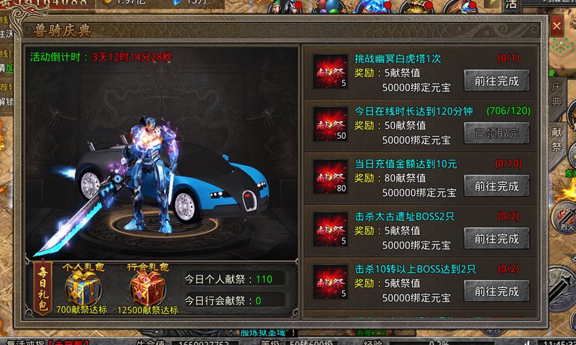 完成指定任务即可获得对应献祭值+元宝奖励,献祭任务次日0时重置数据