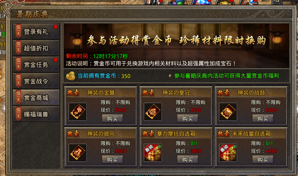 超值折扣4档三折礼包,分别为20元、100元、300元、500元。次日0时重置数据