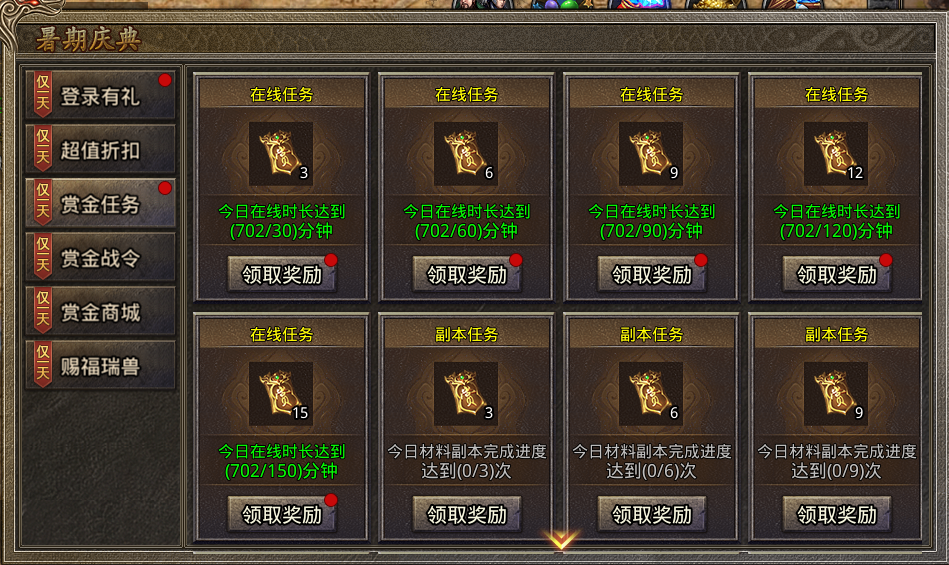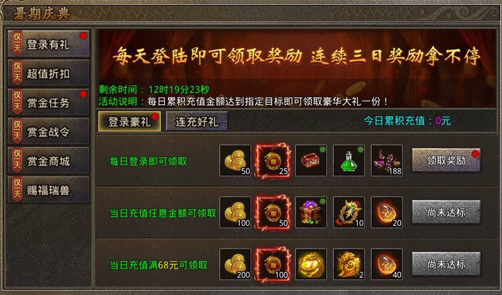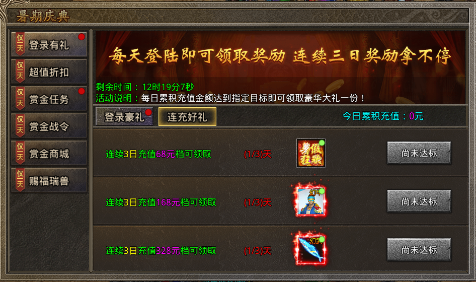 1.每日登录奖励 2.每日充值任意金额奖励 3.每日充值满68元奖励 4.每日充值满168元奖励 5.每日充值满328元奖励