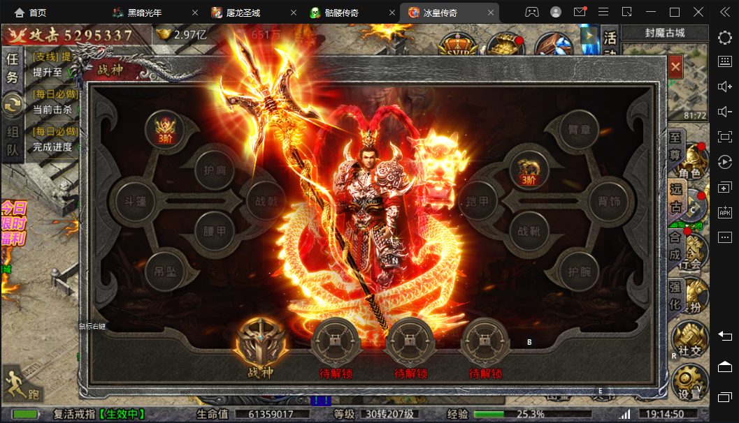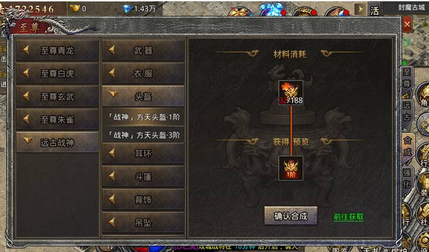 3.战神装备合成系统:入口位于右下角至尊图标-合成页签-远古战神子页签