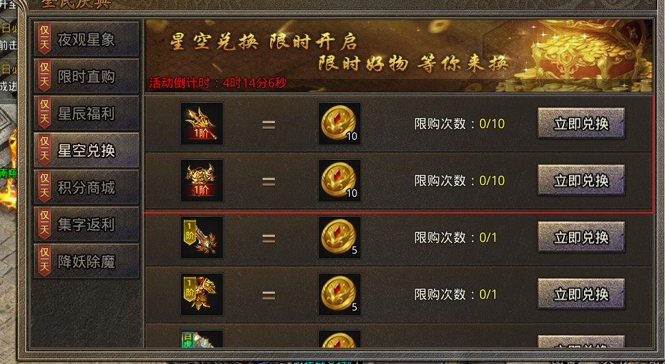 战戟、铠甲主要通过每周三使用地宝兑换,升至3阶总的消耗为10件1阶,所以地宝兑换总的兑换次数上限为10次,如下图: