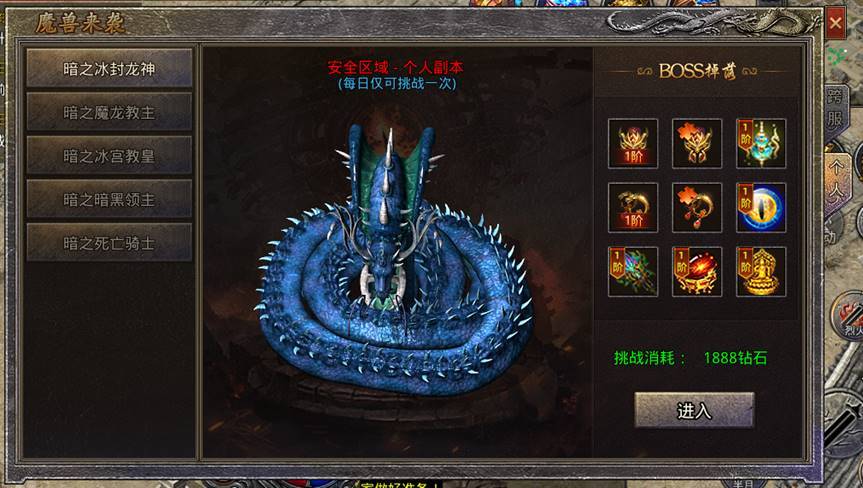 个人副本:每日每只BOSS仅个挑战1次,每次挑战费用:1888钻石