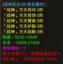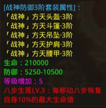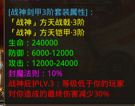 1.战神装备分为三个套装,分别为:战神剑甲套装、战神防御套装、战神攻击套装,装备和套装等阶最高为3阶