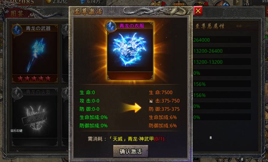 激活及消耗:对应部位1阶成品装备*不等数量