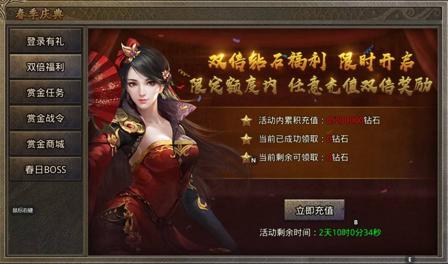 活动期间充值可获得双倍钻石奖励,双倍钻石奖励领取上限为200000钻石