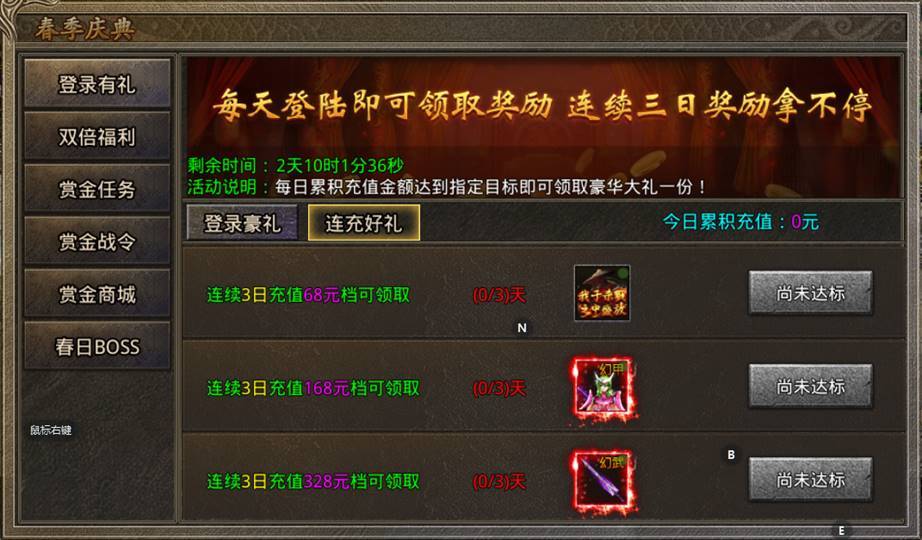 连续3日充值对应档位金额可领取专属时装剑甲及称号
