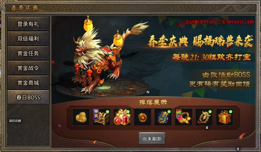 1:BOSS降临活动持续3天,每天21:30刷新春季瑞兽一只,刷新地图:比奇城 ,刷新坐标:156 150