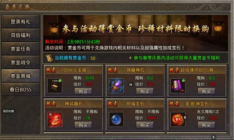 赏金币获得来源:登录有礼、赏金战令、春日BOSS活动内均可获得