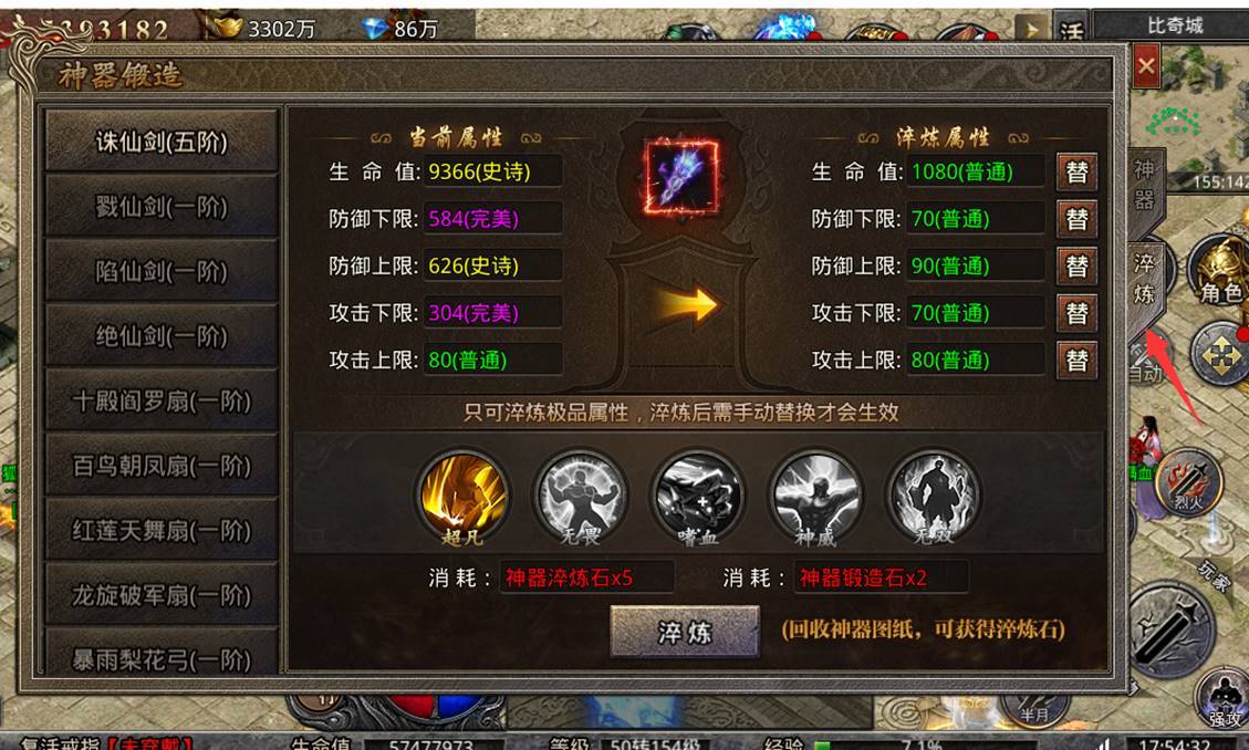1. 神器达到5阶才可进行淬炼