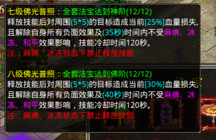 穿戴全套道阶法宝可激活技能:三阶佛光普照(释放技能后对周围5*5的目标造成当前8%血量损失,且解除自身所有负面效果及15秒时间内不受麻痹、冰冻、和平效果影响,技能冷却时间120秒。)
