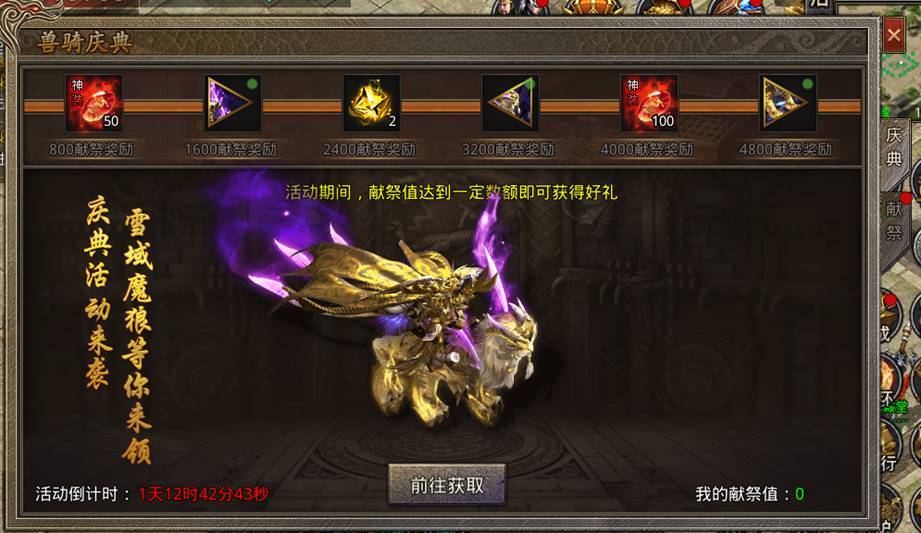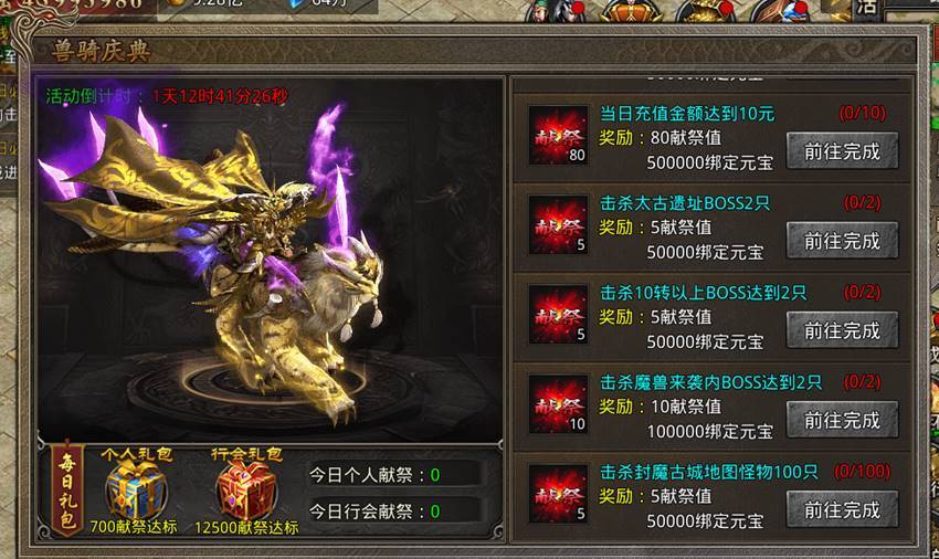 每日行会达标12500献祭值奖励: