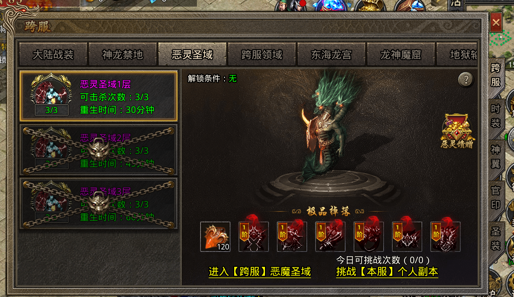恶灵圣域:主要产出恶灵精魄+恶灵八件首饰装备,每日可挑战3次,次日0时重置。