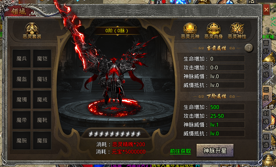 恶灵神脉:使用恶灵精魄可提升神脉等级,恶灵精魄可挑战BOSS爆出也可通过回收恶灵首饰装备获得。