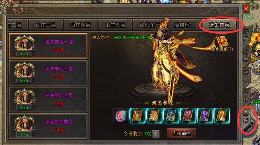 1.新迷失祭坛BOSS挑战界面,入口位于右上角BOSS挑战图标内-圣装页签,如下图: