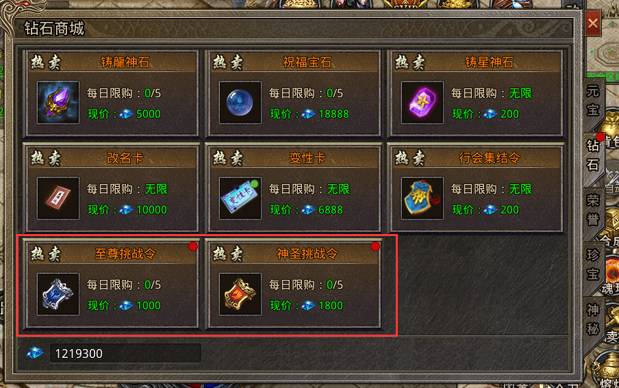 开服第180天,钻石商城内新增道具至尊挑战令、神圣挑战令、每日可购买上限次数:5次