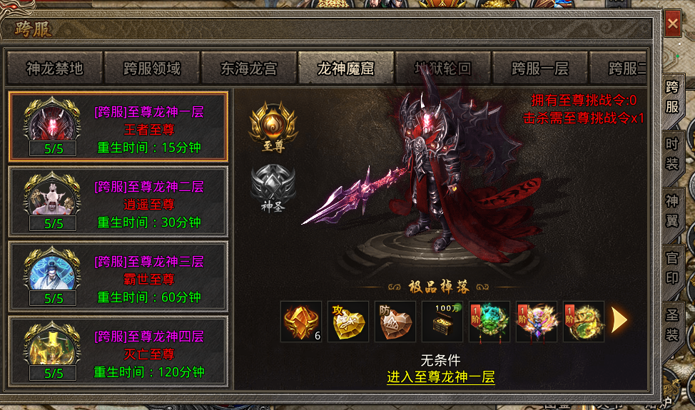 龙神魔窟分为至尊类BOSS及神圣类BOSS,击杀地图内BOSS需消耗对应的挑战令1枚