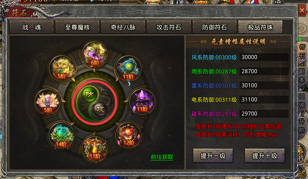 元素增幅分为防御增幅及攻击增幅:每次提升需消耗对应指定材料1颗。