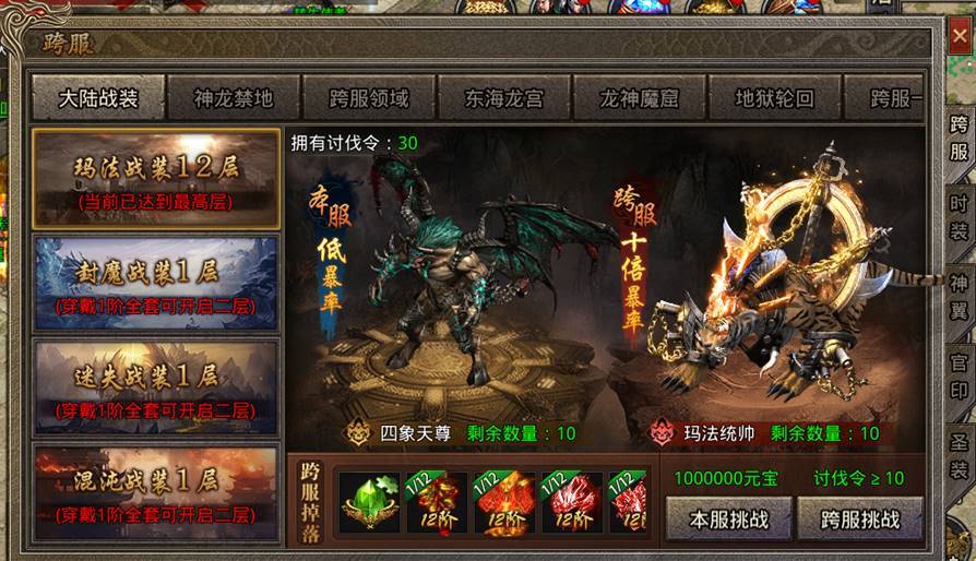 1.每个大陆站桩对应一张地图,每张地图拥有十二层,地图分为本服及跨服,跨服内BOSS拥有十倍掉装率。击杀本服BOSS不需要任何费用,击杀跨服BOSS每只需扣除10讨伐令。
