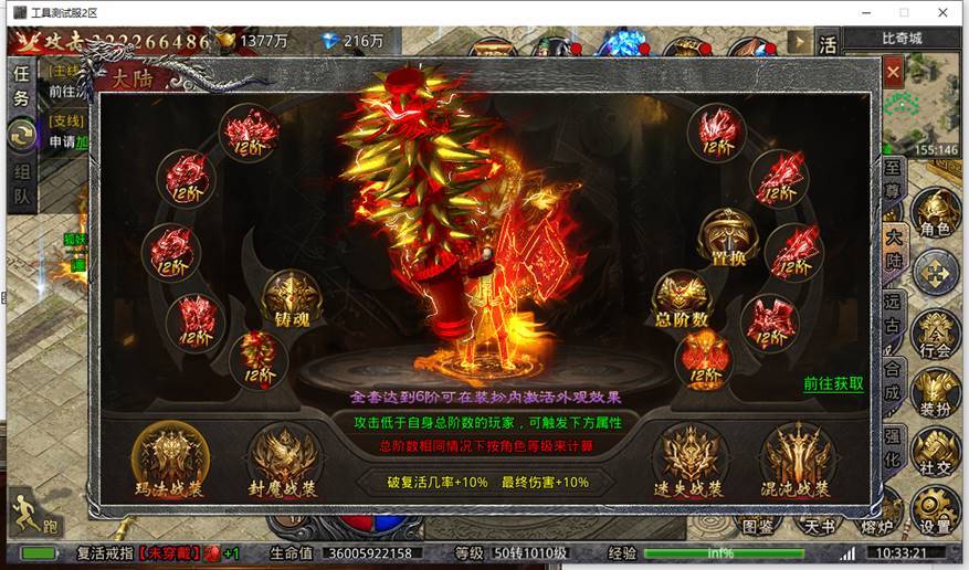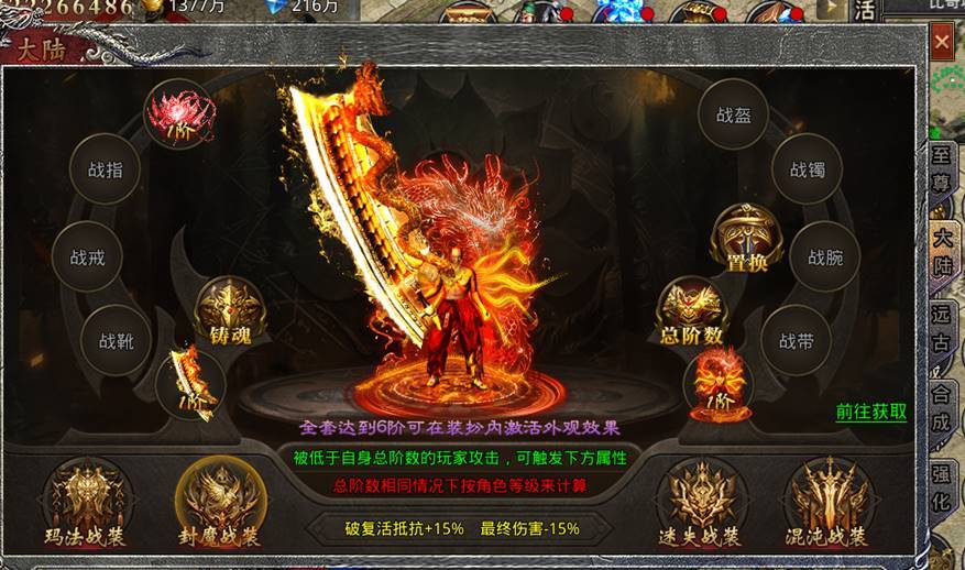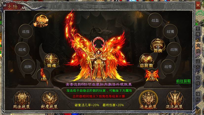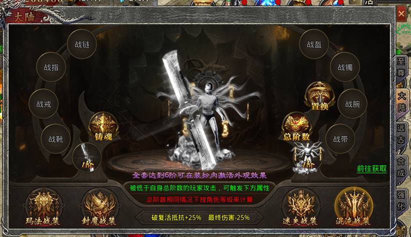 对应战装阶数之和达到一定等级可激活额外属性加成且自身穿戴总阶数高于对方时,攻击可获得破复活几率、破复活抵抗、最终伤害强力属性。