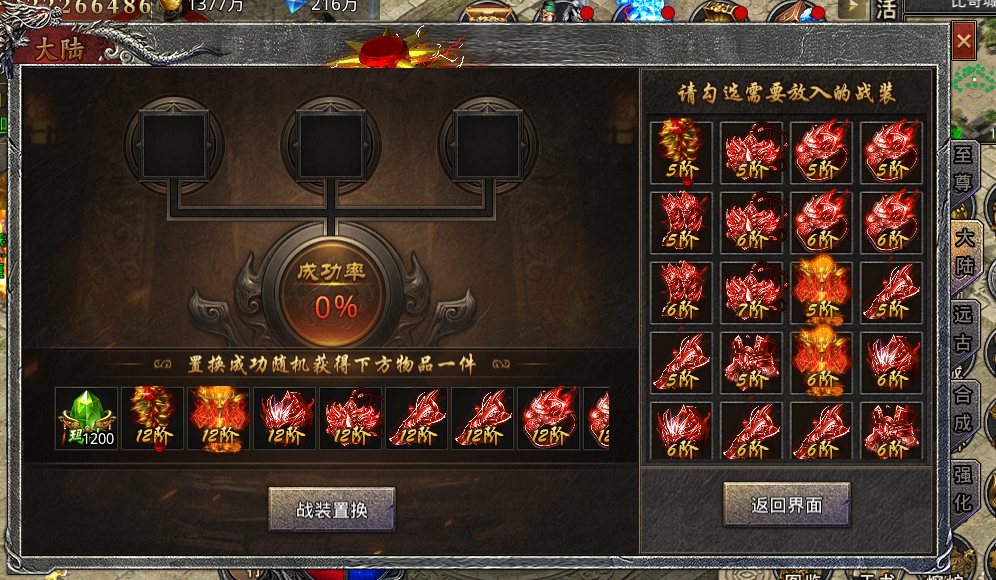 2.置换奖励根据当前穿戴装备来设定,如当前套装满足4阶但不满足5阶时,则置换成功的话会随机获得一件5阶装备,置换放入的战装也需要同阶才可放入。
