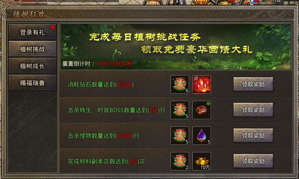 开启区服:2026年03月10日之前以及03月10日开启的区服均开启植树狂欢活动。