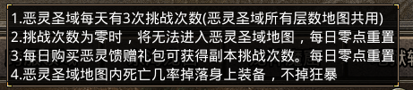 恶灵圣域:主要产出恶灵精魄+恶灵八件首饰装备,每日可挑战3次,次日0时重置。