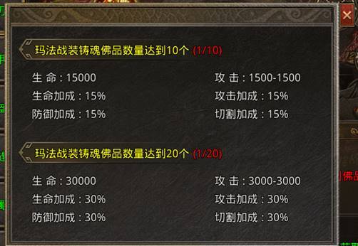 l 对应大陆战装铸魂提升到佛品孔位达到一定数量可获得属性+物品奖励: