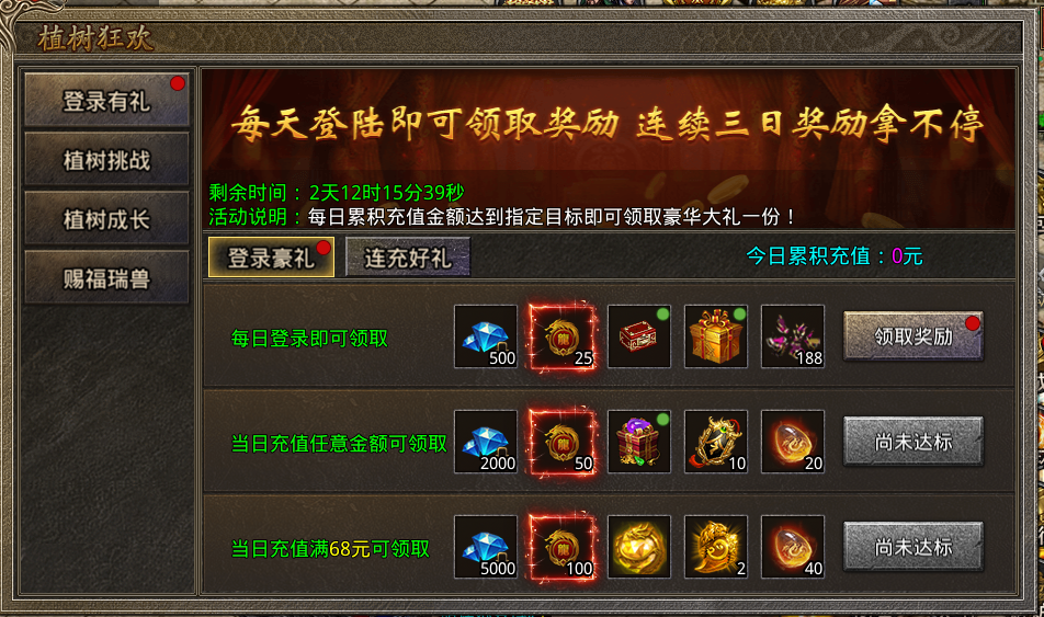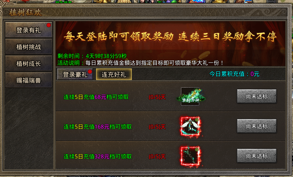 1.每日登录奖励 2.每日充值任意金额奖励 3.每日充值满68元奖励 4.每日充值满168元奖励 5.每日充值满328元奖励